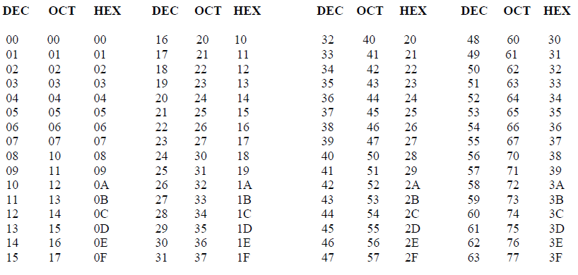 DECIMAL TO OCTAL TO HEXADECIMAL ADDRESS CONVERSION TABLE