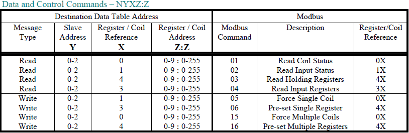 • X = 4 (4X references), YY = 01 (Slave address), Z = 950 (Register address)