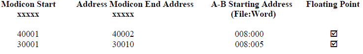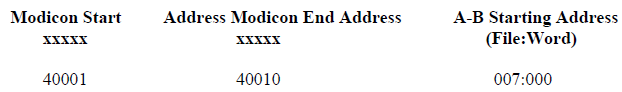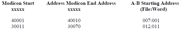 between the Modbus A-B addresses used. For example a Modbus start address of 40001 can be represented in A-B