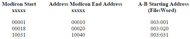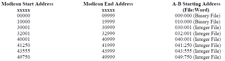 strictly speaking these are not legal Modbus addresses. This feature allows a programmer to align an A-B Binary file