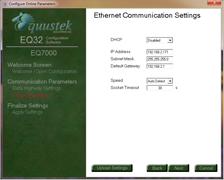 Enter EQ7000 IP address, Subnet Mask and Default Gateway if you have one, then click Next.
