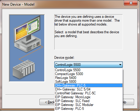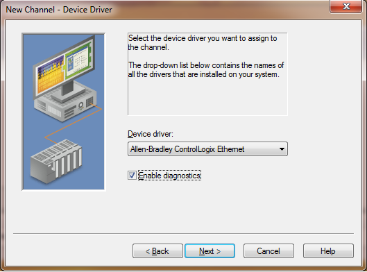 Click on the arrow to bring the Device driver selections, for Ethernet IP driver, select Allen Bradley Control Logix Ethernet as shown.